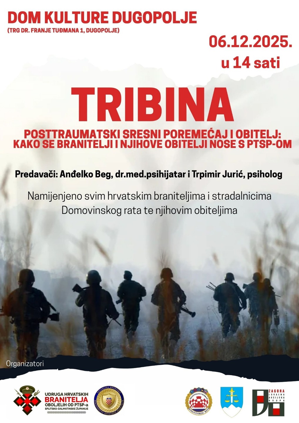U organizaciji UDVDR Podružnice Splitsko dalmatinske i Udruge hrvatskih branitelja liječenih od PSP Splitsko dalmatinske županije 6. prosinca 2025. godine, u prostorijama Doma kulture u Dugopolju održana je tribina - Postraumatski stresni poremećaj i obitelj „ Kako se branitelji i njihove obitelji nose s posttraumatskim stresnim poremećajem“.
